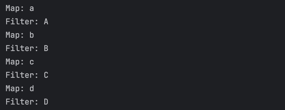 라고 생각하셨다면 아쉽지만 땡입니다. 저도 처음엔 그렇게 생각했고, 개발자 A씨도 그렇게 생각했을거니까 당황하실 필요는 없어요. 위의 생각대로라면 map과 filter은 두 번의 루프를 돌면서 순차적으로 실행되어야 합니다. 하지만 Stream은 그렇게 실행되지 않아요. 위에서도 언급했지만, Stream 파이프라인은 전체가 단 한 번의 루프로 처리됩니다.
